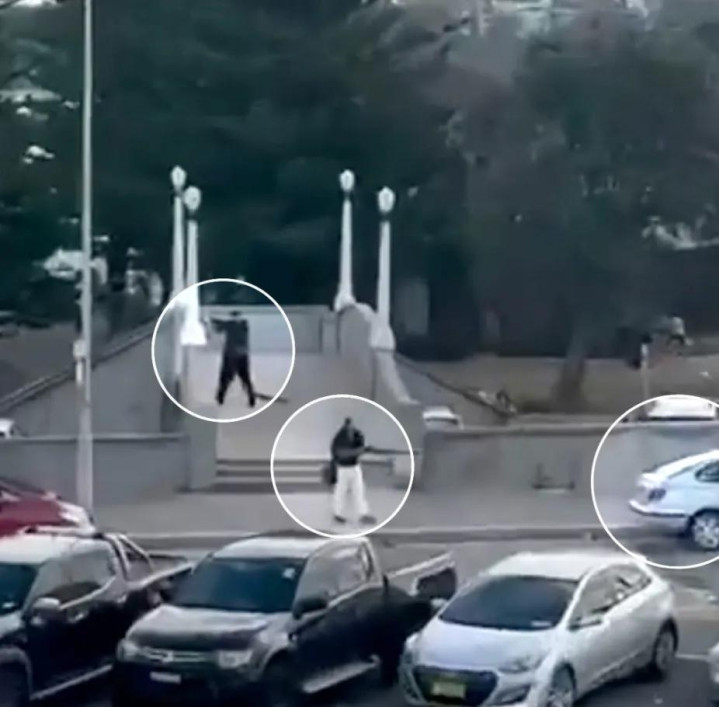 媒体报道的监控画面,先是在桥上对着人群射击: