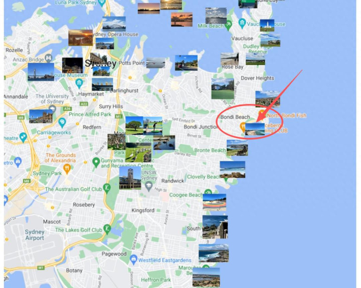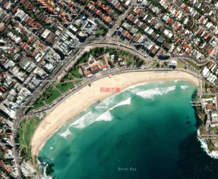先找一下邦迪海滩Bondi Beach,作为著名的旅游景点和悉尼的标志性海滩,还有名字落实,地点很容易就能核准。